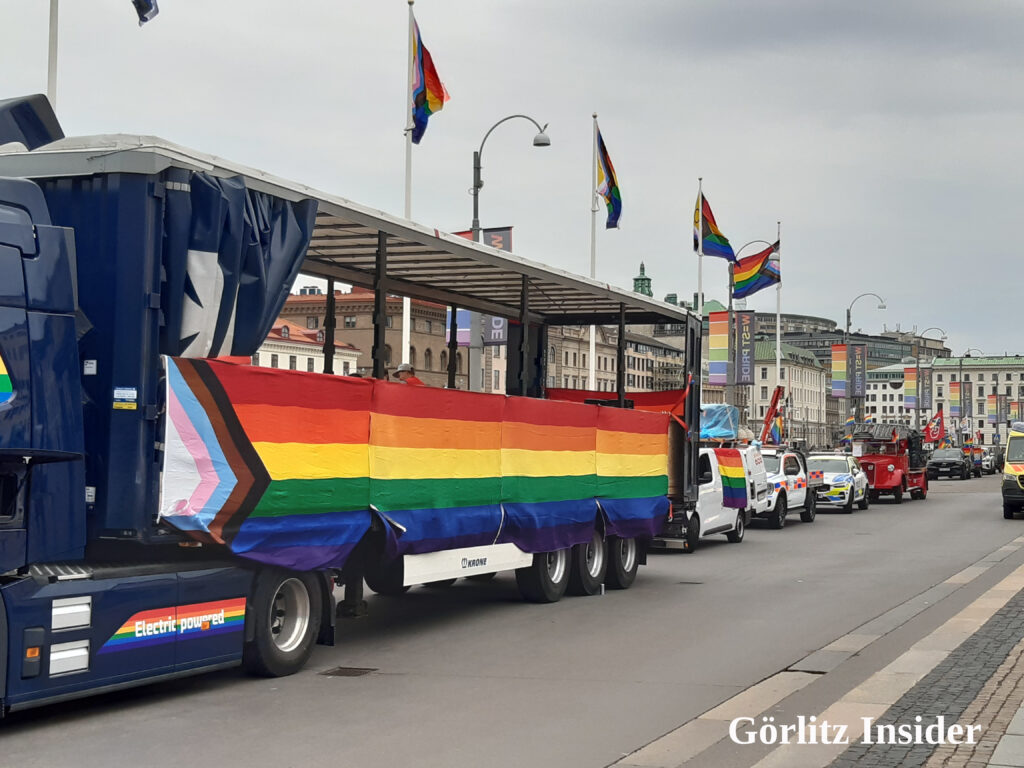 Mehr aus der Fahrzeugkolonne hab ich gar nicht fotografiert. Es reicht aber, damit das Prinzip klar wird. Und nein, es gab KEINEN EINZIGEN politischen Truck. Sondern es gab eine Stadtgesellschaft bzw Unternehmen und Sportvereine aus der Region, die angereist waren mit geschmückten, beklebten Fahrzeugen. Im Grunde ein normaler Stadtumzug, nur eben mit dem LSBT-Ausschnitt der Bevölkerung.