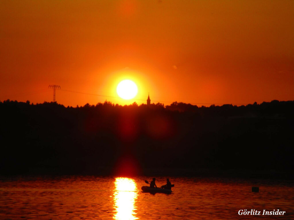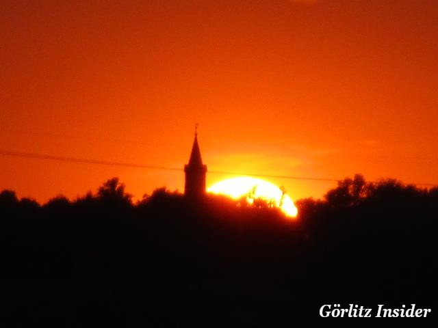 3. August, die Sonne verabschiedet sich glutrot und endlich ist klar: Die Sonne schläft nachts hinter der Kirche von Kunnerwitz. 🙂