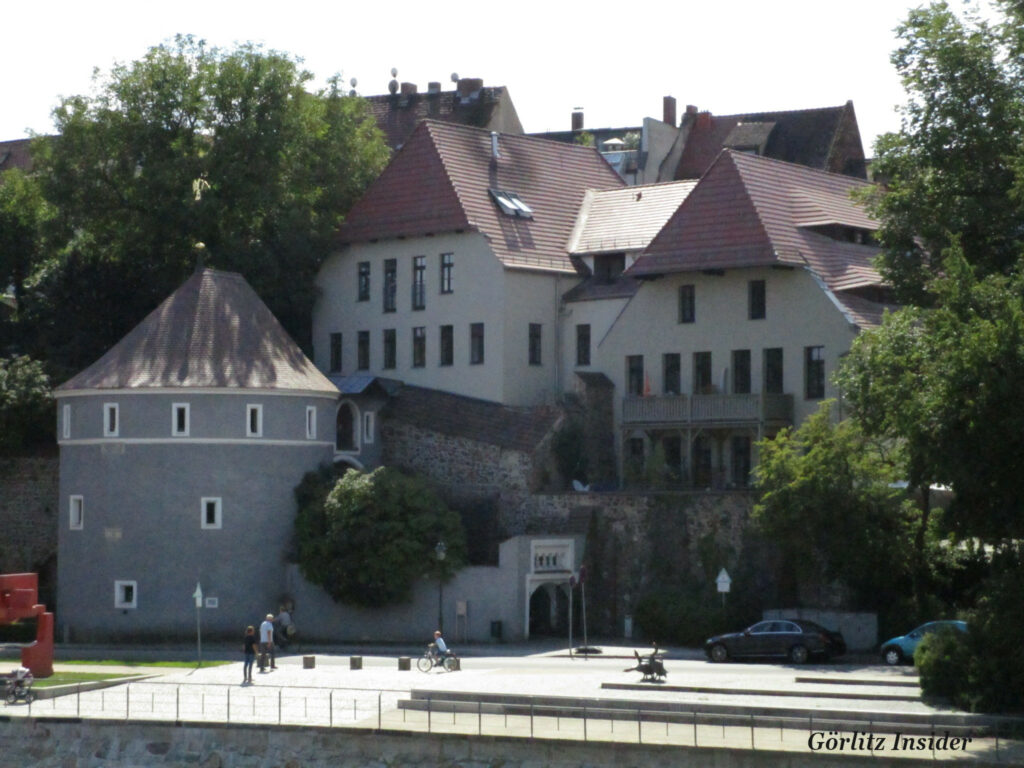 Turm der Ochsenbastei mit historischen Häusern der Neißstraße in Görlitz.