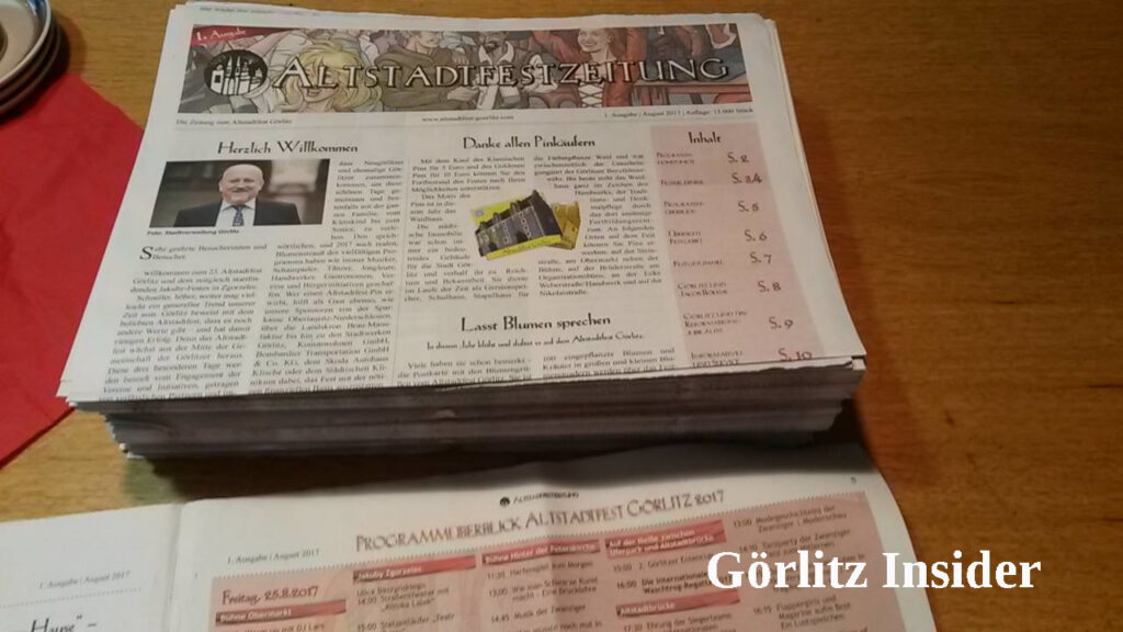 Erstmals gibt es zum Altstadtfest Görlitz eine Zeitung. Ich durfte schon mal reingucken und fand auf den ersten Blick die große Programmübersicht für alle Bühnen genial incl. Plan vom Festgelände (was ist wo). Auf dem zweiten Blick steht super viel Wissenswertes drin: Informationen zu den Künstlern, das Blumenkonzept dieses Jahr. Mehr zur Waschtrogregatter, einer Fotorallye und dem Entencup. Es wird wieder eine Fachkräftebörse für Rückkehrwillige geben u.v.m. Die Zeitung gibt es zum Altstadtpin. Mit ihm unterstützt man das Fest finanziell und hat gleichzeitig ein schönes Andenken und Sammelobjekt.