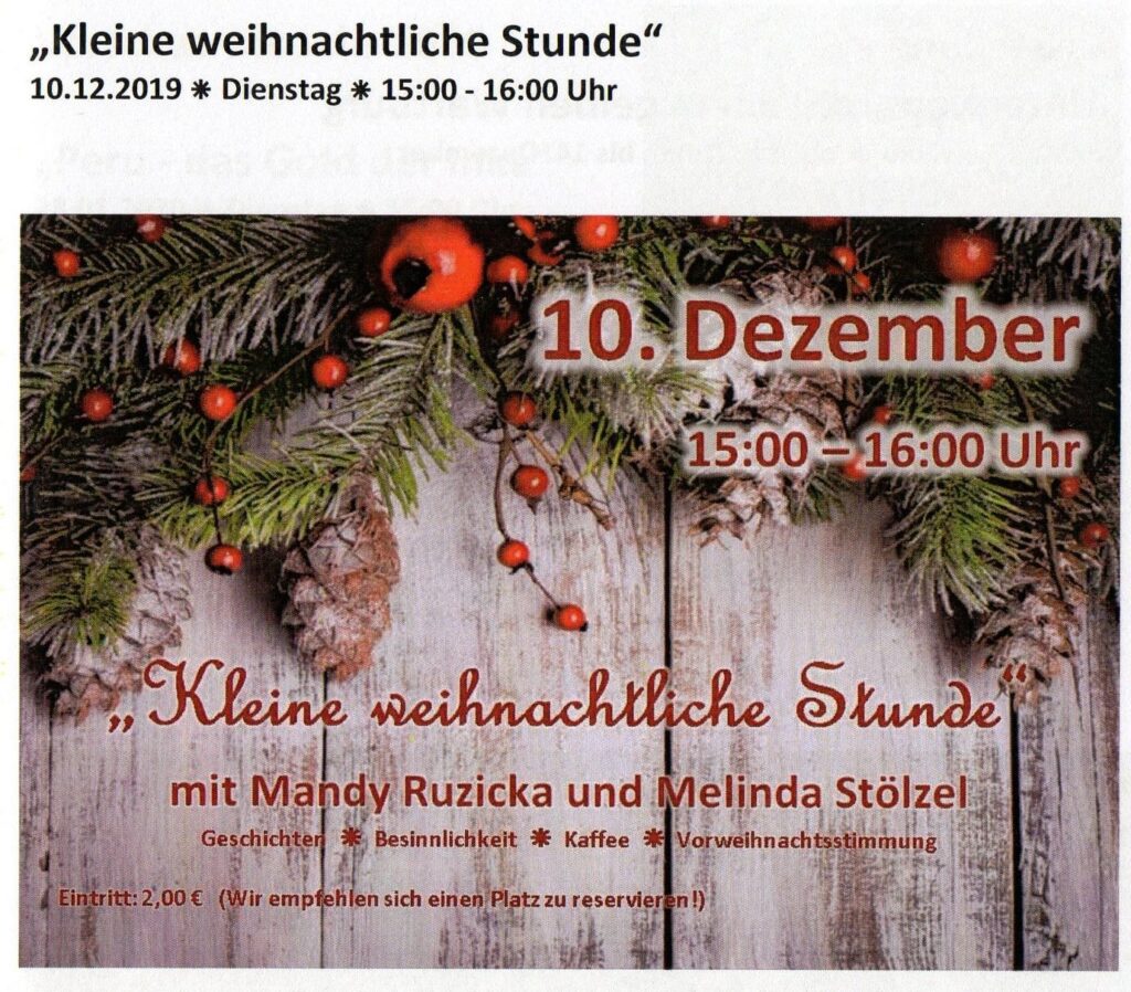 – Die Stadtbibliothek lädt zur „Weihnachtlichen Stunde“, Gedichte und Geschichten bei Kaffee und Kecksen.