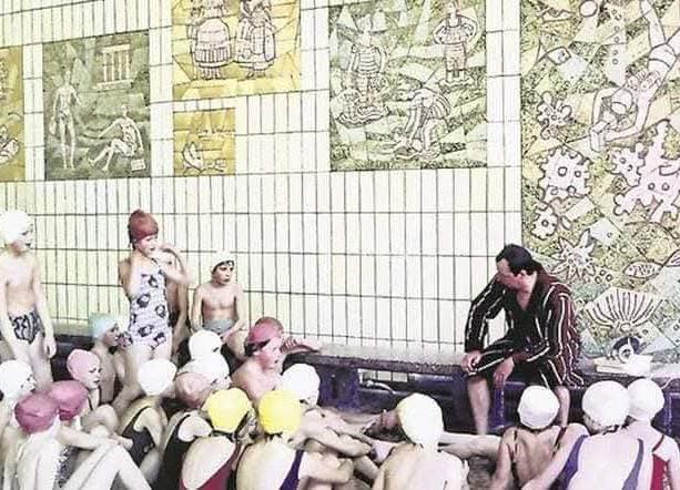 Es waren doch so Mosaike an der Wand der Fichteschwimmhalle. Das hat uns Schiepel damals noch wenig interessiert. Fakt ist aber, dass sie in der Ofenkachelfabrik in Rauschwalde hergestellt wurden, eigenes für die Schwimmhalle. Es waren die Herren Georg Nawroth und Karl-Heinz Völker. Die neun Bilder zeigten die Entwicklung des Schwimmens in der menschlichen Gesellschaft.