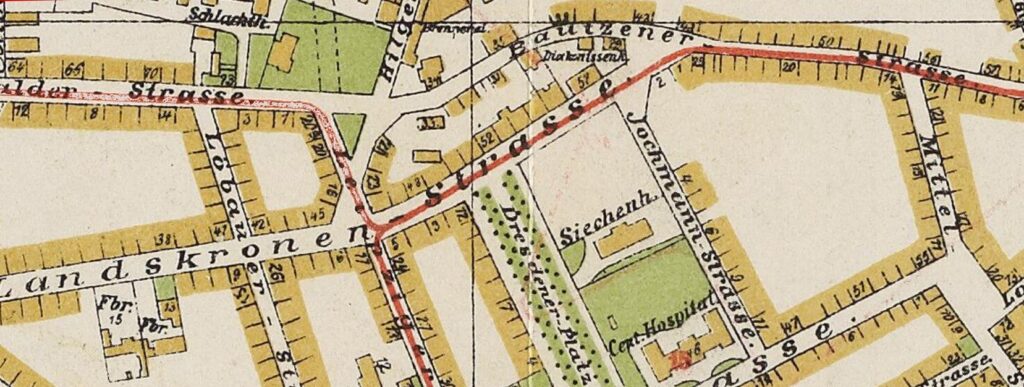 In der Bautzener Straße waren sogar zwei Linien unterwegs. Die Ringbahn. Und auch die Linie, die zum Kreisbahnhof fuhr (und später bis nach Rauschwalde). Zur Postkarte.
