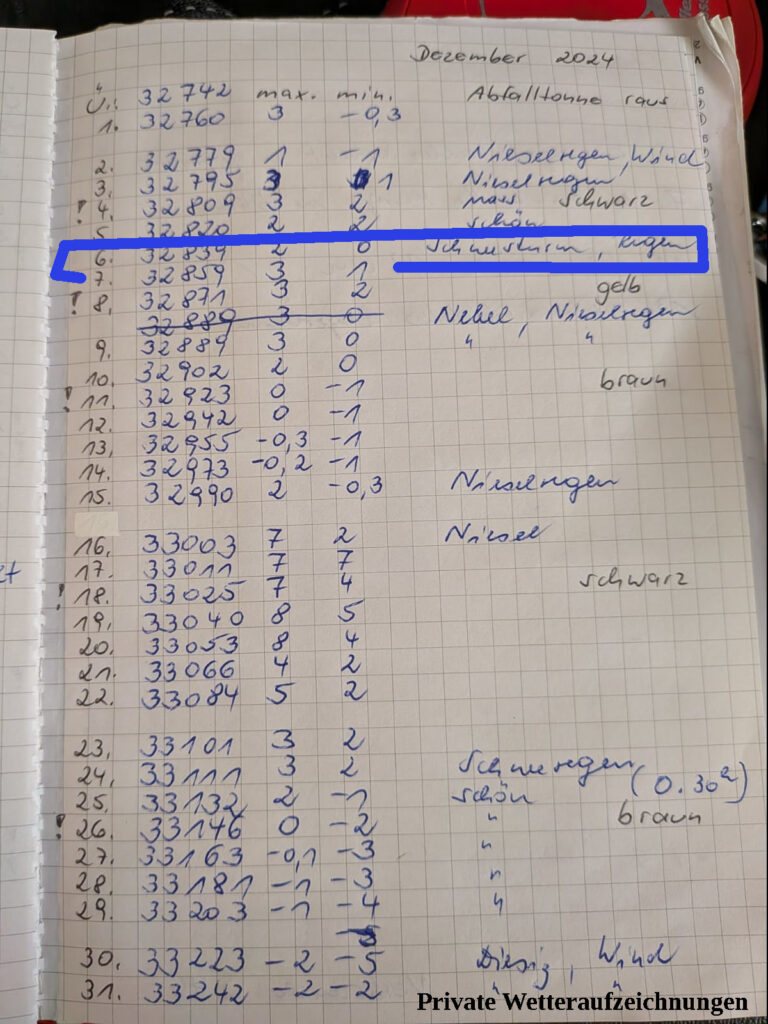 Der Dezember 2024 hat auf den ersten Blick gar kein Schnee. Sondern nur ein Schneesturm mit Regen. Nichts was liegen bleibt. Nur das zweite Datenblatt wusste was von „Schneeverwehungen“. Aber ob sowas zum Loipen spuren und Ski fahren reicht?