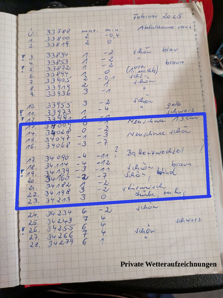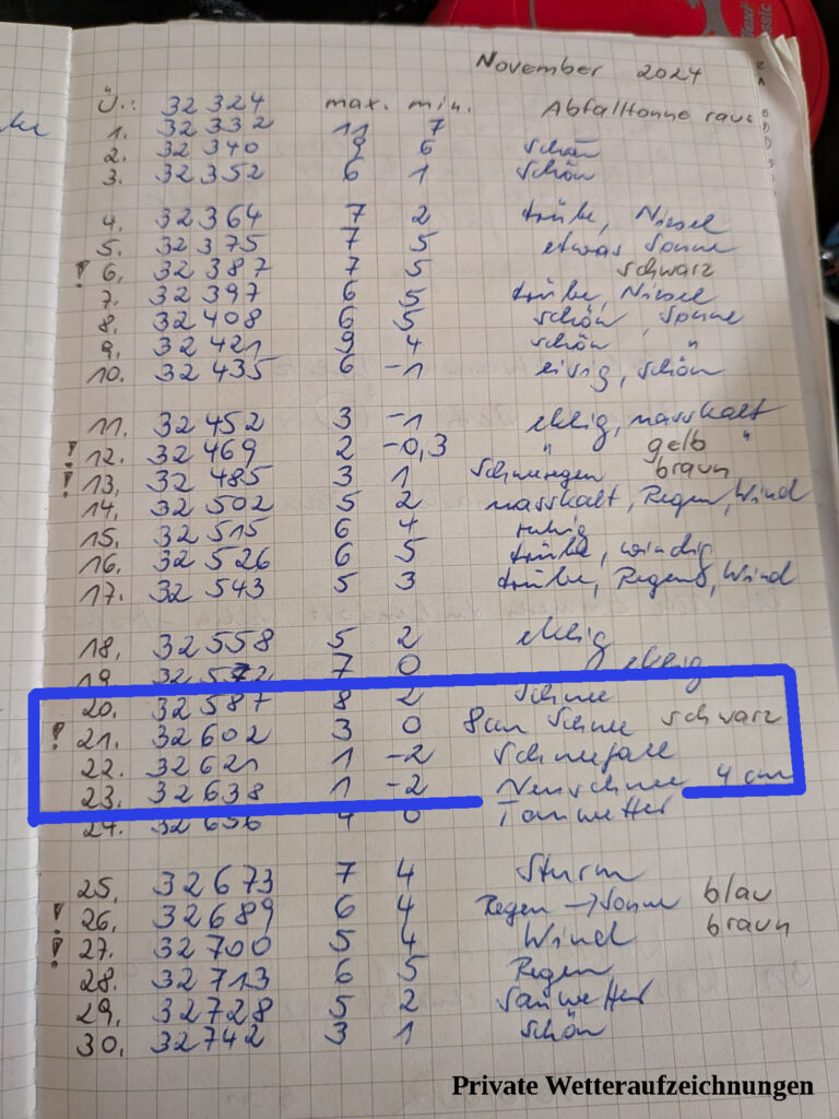 „Mein Mutti hält täglich Höchst- und Tiefsttemperatur fest. Ist immer ein Blatt zu Temperatur und Wetter allgemein und dann paar Details wie Schneefall. Stehen nur noch paar andere Termine drinne. Anhand Schneefall und Temperatur ließe sich dann bisschen was ableiten.“