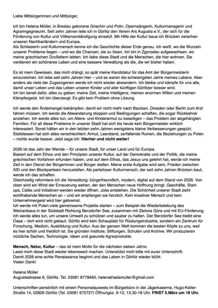 Am 10.05.2026 wählt Görlitz den nächsten OB. Nun gibt es einen parteilosen Kandidaten, derzeit wohnhaft in Magdeburg, gebürtiger Görlitzer. Er braucht vorab 160 Unterstützungsunterschriften, die in der Jägerkaserne geleistet werden müssen, damit er im Mai auf dem Wahlzettel steht. Folgendermaßen stellt er sich selbst vor: