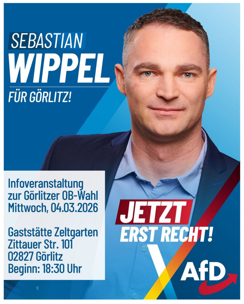 „Wahlberechtigte können ihre Unterschrift bis zum 05. März 2026, 18:00 Uhr in der Stadtverwaltung Görlitz, im Bürgerbüro in der Jägerkaserne, Hugo-Keller-Straße 14, 02826 Görlitz leisten“ (Infos)