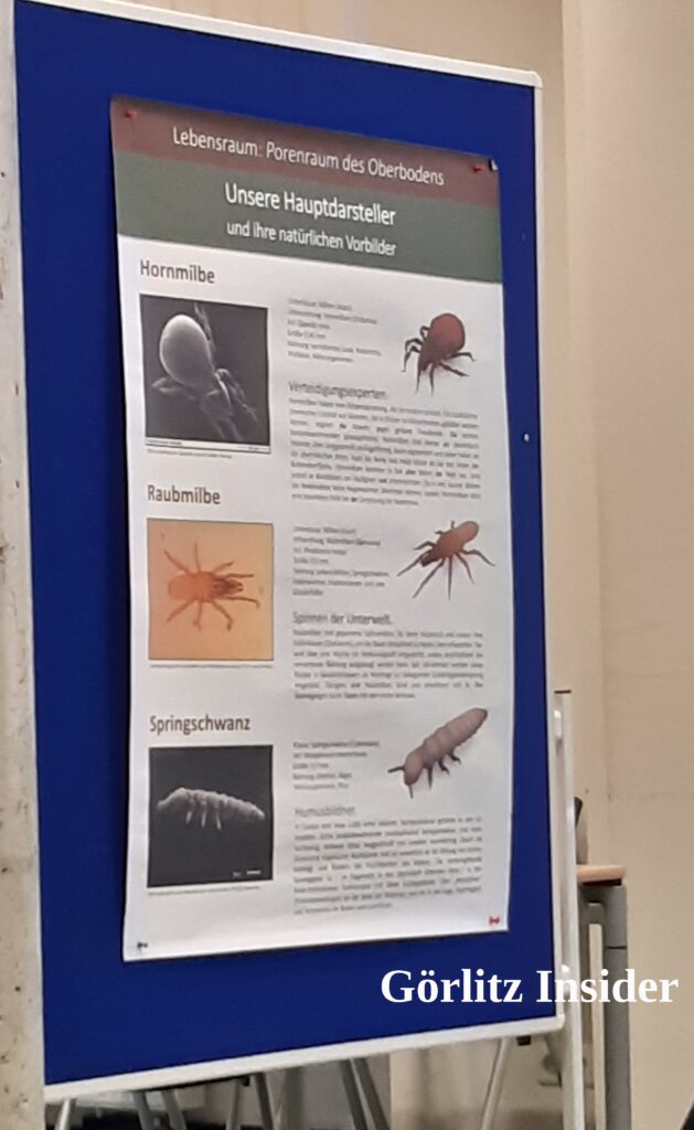 Die nächste Bodenschicht ist der Humus, der sogenannte „Porenraum“. Hier braucht es nun die Taschenlampe, um die Kollegen Raub- und Hornmilbe, Springschwanz, Hundertfüßler und Weißwurm beim geschäftigen Treiben zu beobachten. Selber ist man in dieser Simulation kaum größer, als 10 mm.