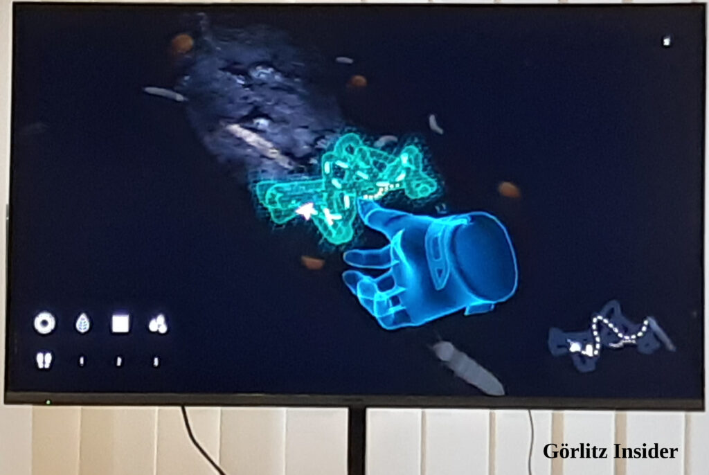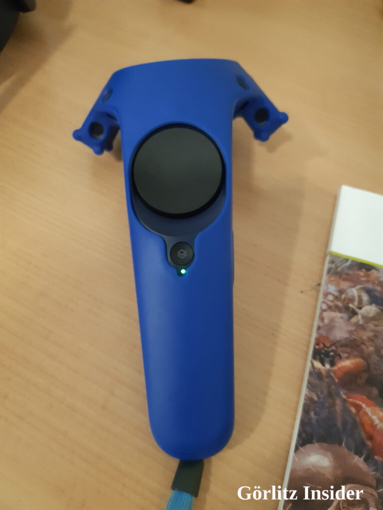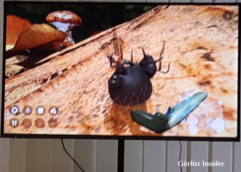 Auf den Kopf gibt es eine VR-Brille. In dieser Simulation sieht man den Raum des Museums, der einen umgibt, nicht mehr. Es gibt VR-Spiele, da nimmt man weiterhin die Umgebung wahr. Hier nicht! Aber keine Sorge: Jemand vom Museum ist dabei, erklärt die Dinge, die man sieht und was da alles krabbelt. Die Simulation selber hat eine Begrenzung, so dass man unter der VR Brille nirgends anstößt – auch wenn man in der Realität nichts mehr sieht.
