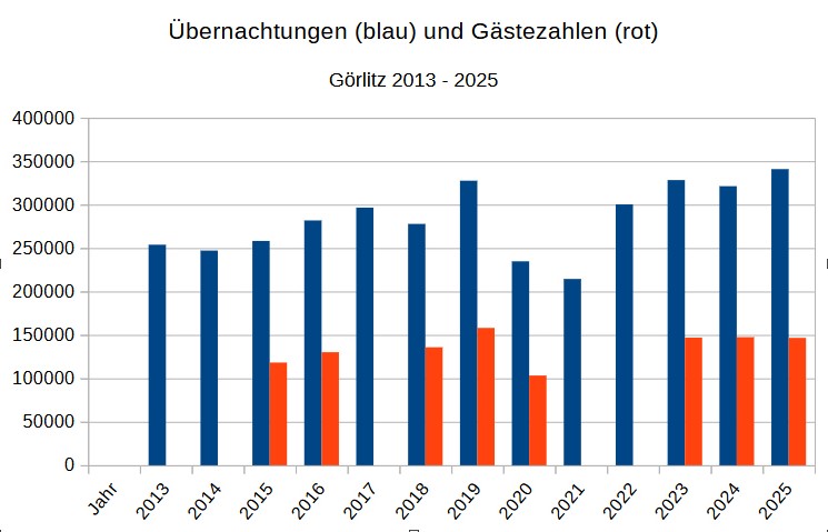 Görlitz war 2017 bereits kurz vor der 300.000. Übernachtung des Jahres. 2019 gelang es erstmals, diesen Wert zu übersteigen. Corona bremste die Entwicklung aus. Seit 2022 wird der Wert wieder erreicht. Aktuell liegt er 2025 bei 340.851 Übernachtungen im Jahr. Der Höchststand seit 2013.