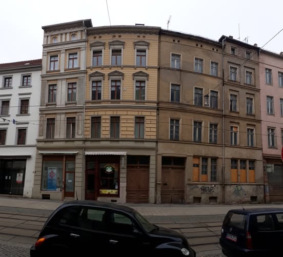 Hartmut schreibt: „Kaum noch als Zwillingshäuser zu erkennen, Berliner Straße 38a und 39. Während das linke Haus noch den Gründerzeitlichen Schmuck und Stuck trägt, hat das rechte Haus ihn (vermutlich bei der Straßensanierung Anfang der 1980er Jahre) verloren und trägt eine vereinfachte Fassade. Auch die Erdgeschosse sind verschieden, Haus 38a hat Ladeneinbauten.